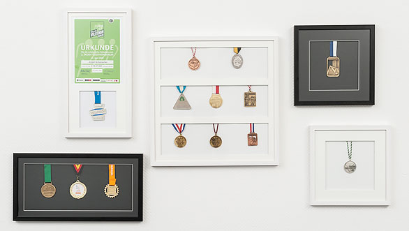 De rammer, der er lavet til opbevaring af medaljer, er derfor forsynet med en såkaldt afstandsliste, der, som navnet antyder, skaber den påkrævede afstand mellem bagvæggen og glaspladen. Hver ramme har desuden også en stabil passepartout, der er optimalt skåret afhængigt af antallet og grupperingen af medaljerne. Den understøtter en enkel og praktisk præsentation af medaljerne og hjælper til en bedre dybdeeffekt. Båndene gemmes på kunstfærdig vis bagved kartonet, og medaljen får således en fremtrædende placering. Størrelsen på medaljen er heller ikke noget problem. Derfor spiller sportsgrenen, i hvilken medaljen blev vundet, ikke nogen afgørende rolle for om trofæet passer ind i rammen eller ej.