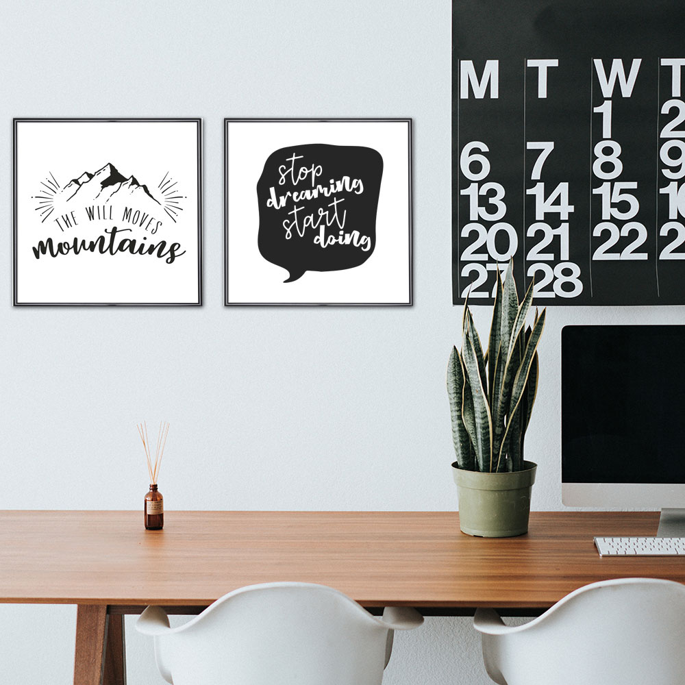 Mulighederne er uendelige. Med vores software kan du vælge skriftstørrelse og type, eksperimentere med detaljerne og også bringe farve ind i billedet. Vi udskriver ordsproget på papir af høj kvalitet og indrammer det for dig. Sloganene modtages i kvadrate billedrammer på 30x30 cm, som enten er lavet af træ, kunststof eller aluminium. Hvis du ønsker det, kan du også vælge en rammeløs billedholder.