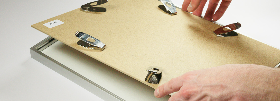 - Trin 3: Billedet lægges ind mellem bagpladen og glasset, og begge dele sættes på plads i rammen igen.